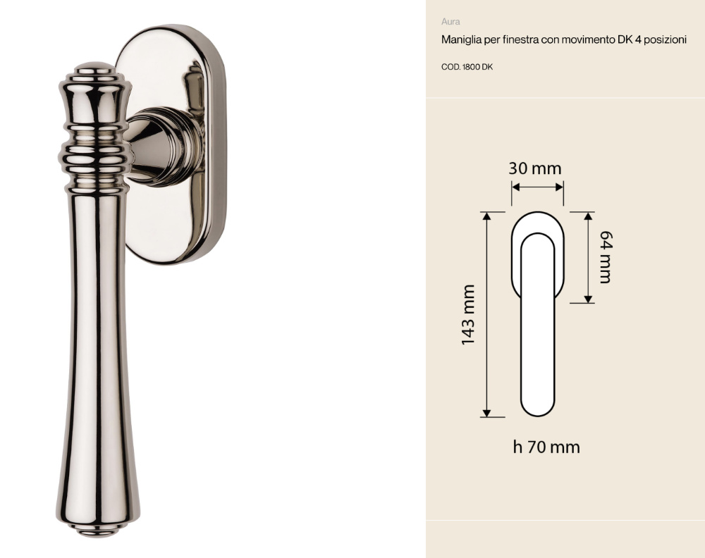 poignée de fenêtre Aura de Linea Calì représente la synthèse parfaite entre tradition et élégance contemporaine.