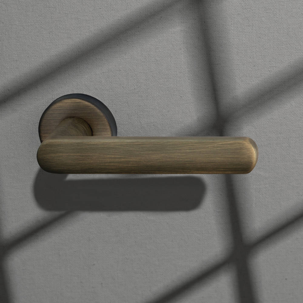 Voici la poignée Reguitti Aura avec rosace ronde. Vous pouvez demander la version avec rosace carrée ou minimaliste (contactez-nous si vous êtes intéressé).