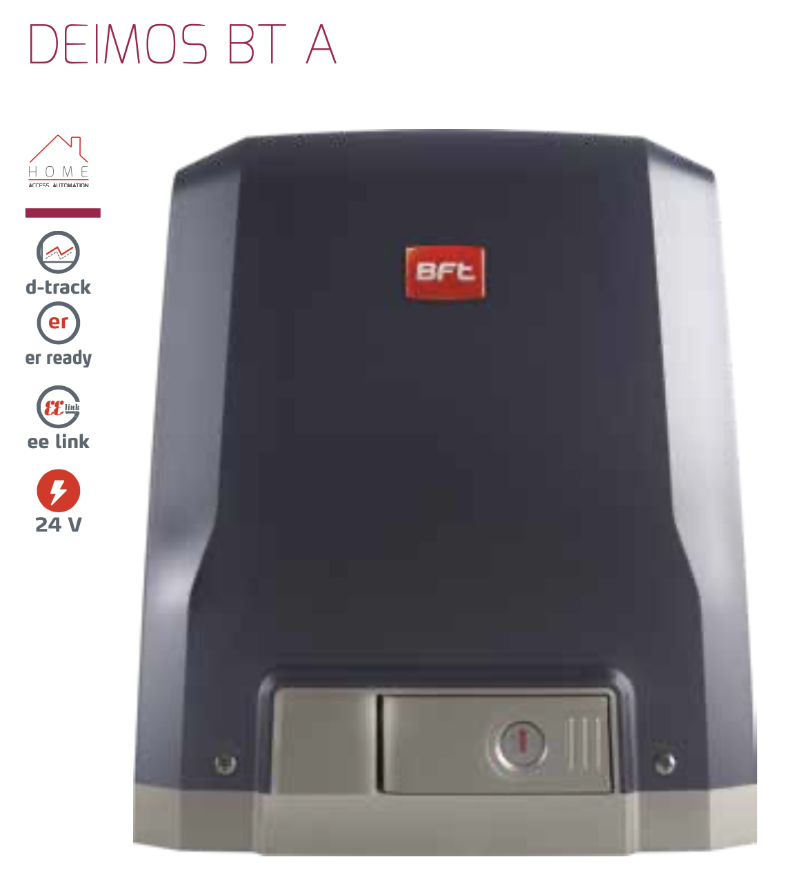 - 1 DEIMOS BT A400 : opérateur 24 V pour portails coulissants jusqu'à 400 kg. Vitesse du vantail 12 m/min ;