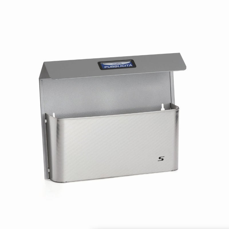 Boîte publicitaire bimétallique Silmec avec toit, composée d'une face avant en acier inoxydable DTL anti-rayures et d'un dos en aluzinc peint en différentes couleurs. Également disponible entièrement en acier inoxydable DTL (sélectionnez la variante souhaitée).