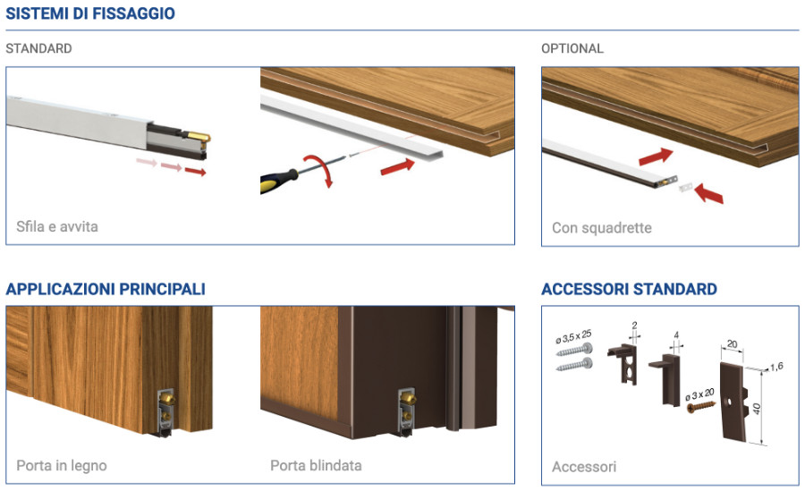 Le coupe-vent Comaglio 1700 est un système automatique breveté qui, lorsque la porte est fermée, bloque automatiquement la possibilité que le froid, la poussière et le bruit envahissent notre environnement.