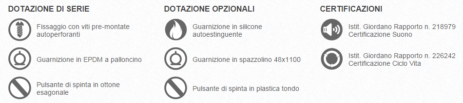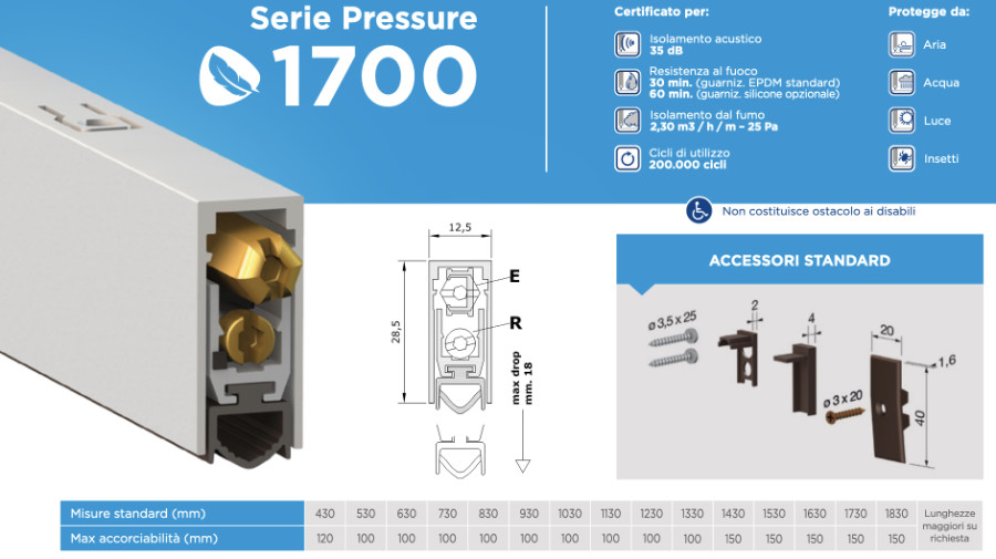 La série Pressure se caractérise par le mécanisme breveté à double registre ; il s'agit d'un mécanisme breveté visant à la fermeture parfaite de l'espace entre la porte et le sol, même du côté opposé au bouton poussoir.