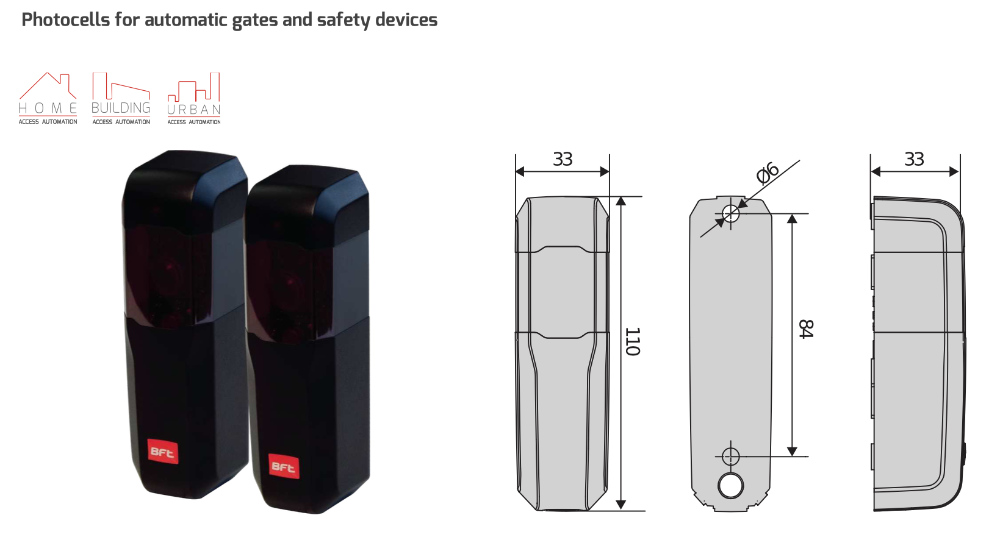 La large compatibilité d'alimentation (12–33 Vca et 15–35 Vcc) permet d'utiliser ce kit dans la quasi-totalité des installations de portails automatiques. Les photocellules sont compatibles avec toutes les centrales BFT prenant en charge la gestion de sécurité certifiée.