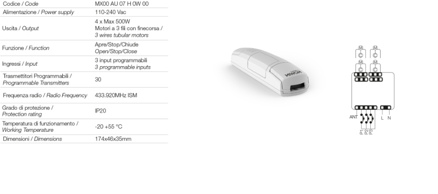 peut piloter jusqu'à quatre actionneurs 230 Vca , d'une puissance maximale de 500 W chacun, et est compatible avec les moteurs à trois fils équipés de fins de course. Ses trois entrées filaires programmables permettent une commande pas à pas, une commande de sécurité (avec homme mort) ou la gestion de capteurs météorologiques. Les fonctions d'ouverture, d'arrêt et de fermeture sont entièrement configurables, ce qui rend le système adapté aux environnements résidentiels et professionnels.