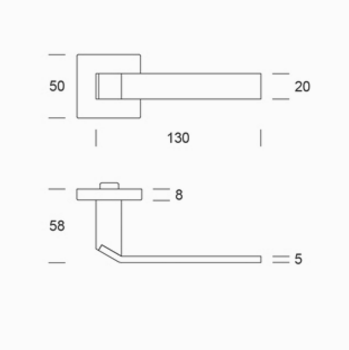 - Poignée avec plaque coudée à 30° sur rosace carrée avec ressort de rappel. Longueur de la poignée : 130 mm ; hauteur : 20 mm.