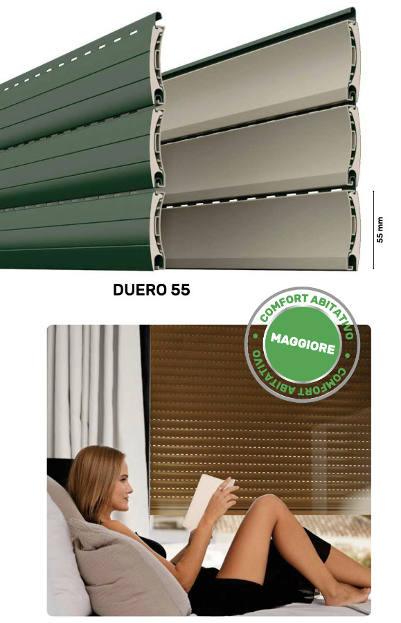 Duero55 est composé d'un profilé de volet roulant en aluminium avec interposition de mousse de polyuréthane couplé par emboîtement avec un profilé PVC auto-extinguible. L'espace central entre les deux matériaux crée une chambre à air de ruche.