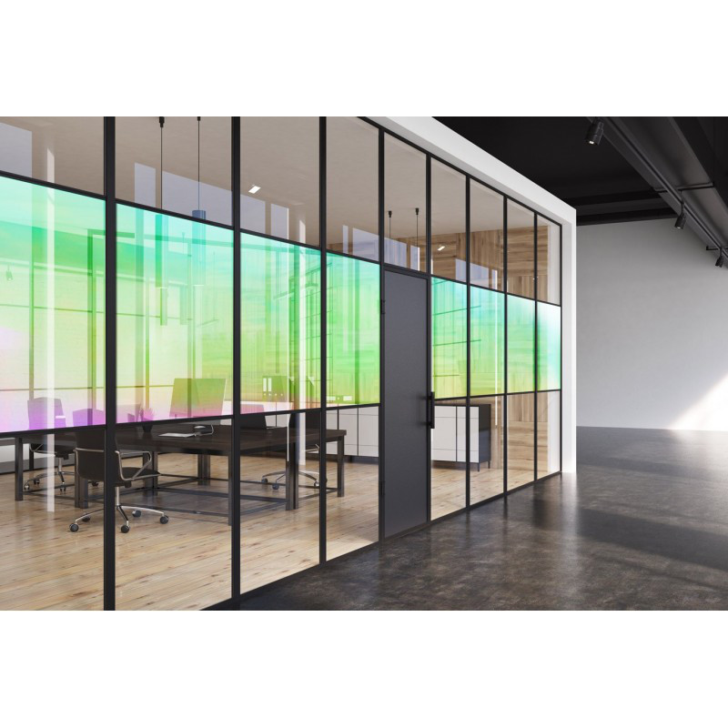 Le film décoratif adhésif Reflectiv DCH 326 est un excellent choix pour ceux qui cherchent à embellir les espaces sans sacrifier la luminosité . Ce film permet non seulement le passage de la lumière, mais la transforme en un spectacle enchanteur de reflets multicolores qui s'étendent du jaune au violet.