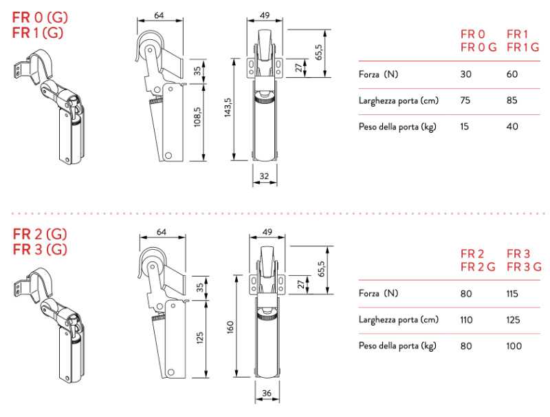 Le frein de porte a la possibilité de régler la vitesse de fermeture de 1 à 10 secondes (uniquement pour les modèles à fermeture réglable).