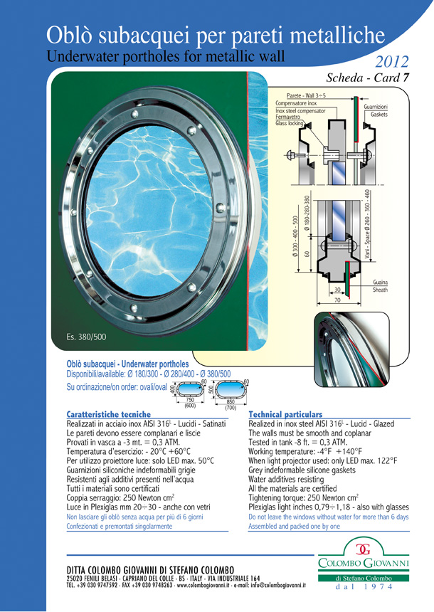Dans son usine de Brescia (à Fenili Belasi), la société Colombo conçoit et fabrique ses produits en améliorant constamment leur qualité. Dès la conception de ces hublots, l'objectif est d'atteindre une satisfaction client maximale en prenant en compte leurs besoins précis. C'est pourquoi nous pouvons garantir la durabilité et la fonctionnalité de ces magnifiques hublots.