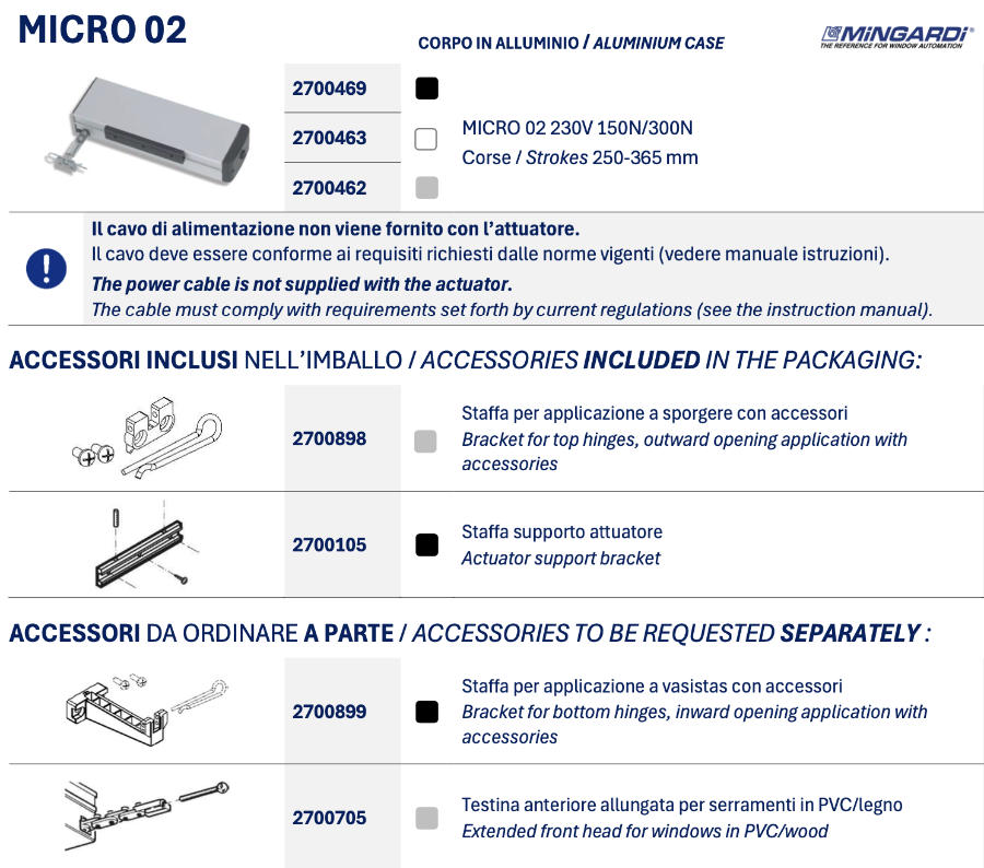 Mingardi Micro 02 230V est un moteur à chaîne pour l'ouverture et la fermeture automatique des fenêtres à soufflet et à soufflet.