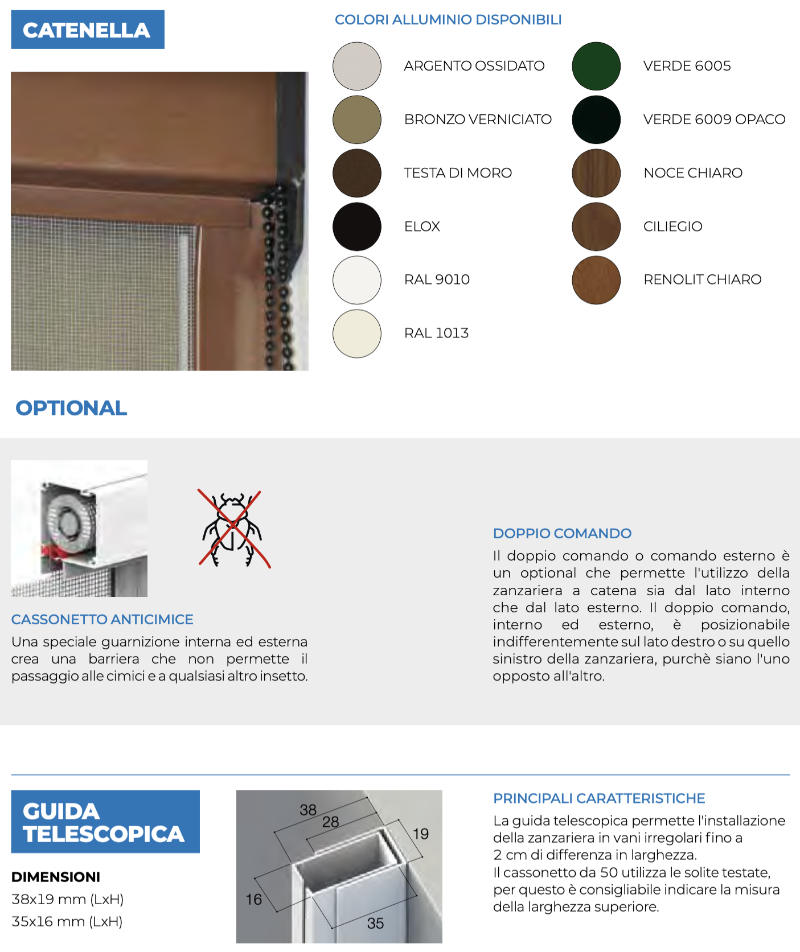 double commande interne et externe en option peut être positionnée sur demande sur le côté droit ou gauche de la moustiquaire , à condition qu'elles soient face à face (il n'est pas possible d'installer la double commande interne et externe sur la même plaque). ) . Il faut également considérer que la demande de commande externe entraîne un encombrement supplémentaire d'environ 10 mm en plus de celui du coffret, puisque la chaîne externe sort par l'avant.
