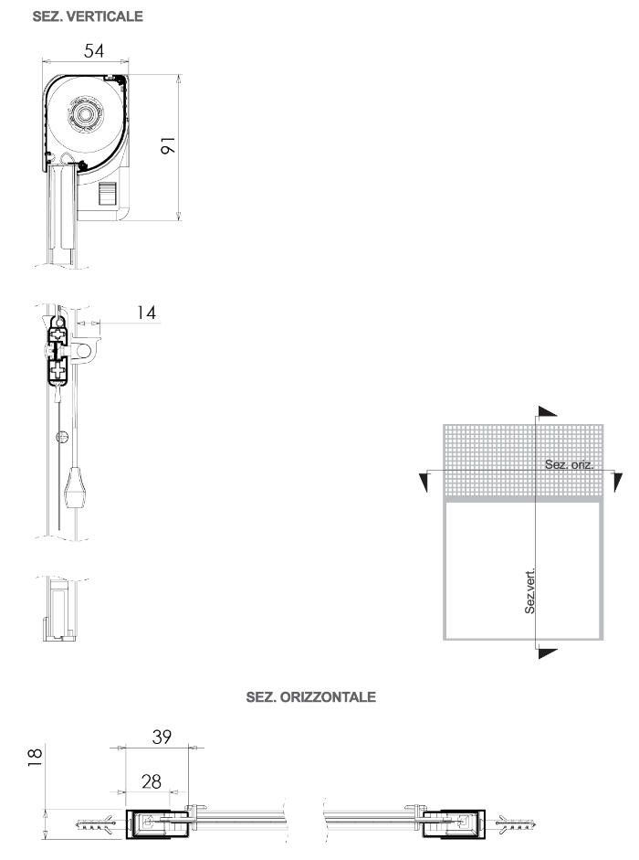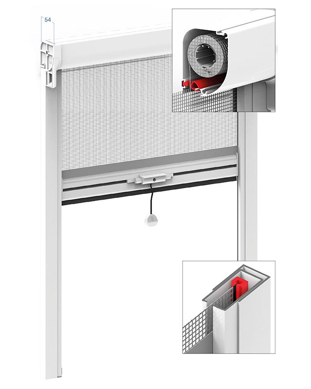 ressort avec une boîte coulissante verticale arrondie de 50 mm et caractérisée par un filet avec un système de fermeture éclair et la particularité d'être un modèle de moustiquaire