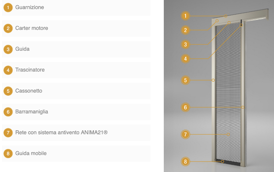 Elle intègre le système innovant de moustiquaire coupe-vent ANIMA21 Bettio, qui permet à la moustiquaire de se rétracter automatiquement en cas de vent fort ou d'impact. Les profils et les plastiques sont conçus pour les moustiquaires anti-punaises de lit, capables de créer une barrière efficace contre les punaises de lit.
