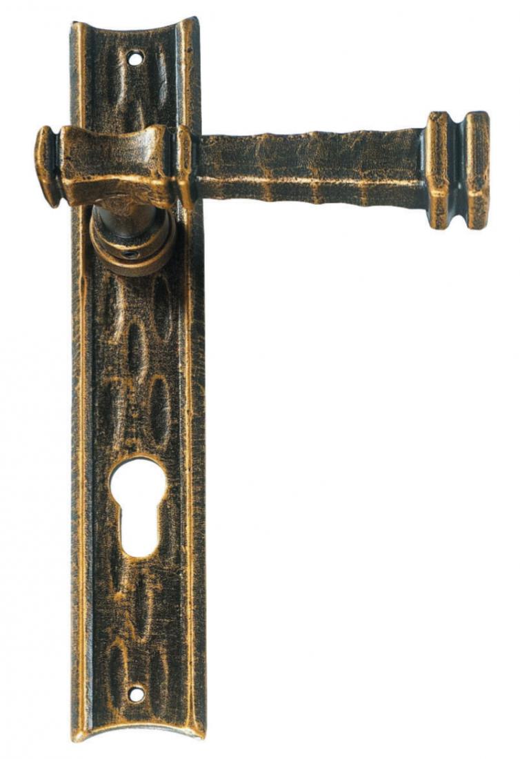 Galbusera 2220 est une poignée de porte en fer forgé artisanale sur plaque, caractérisée par un style antique et des décorations martelées qui rappellent la tradition.