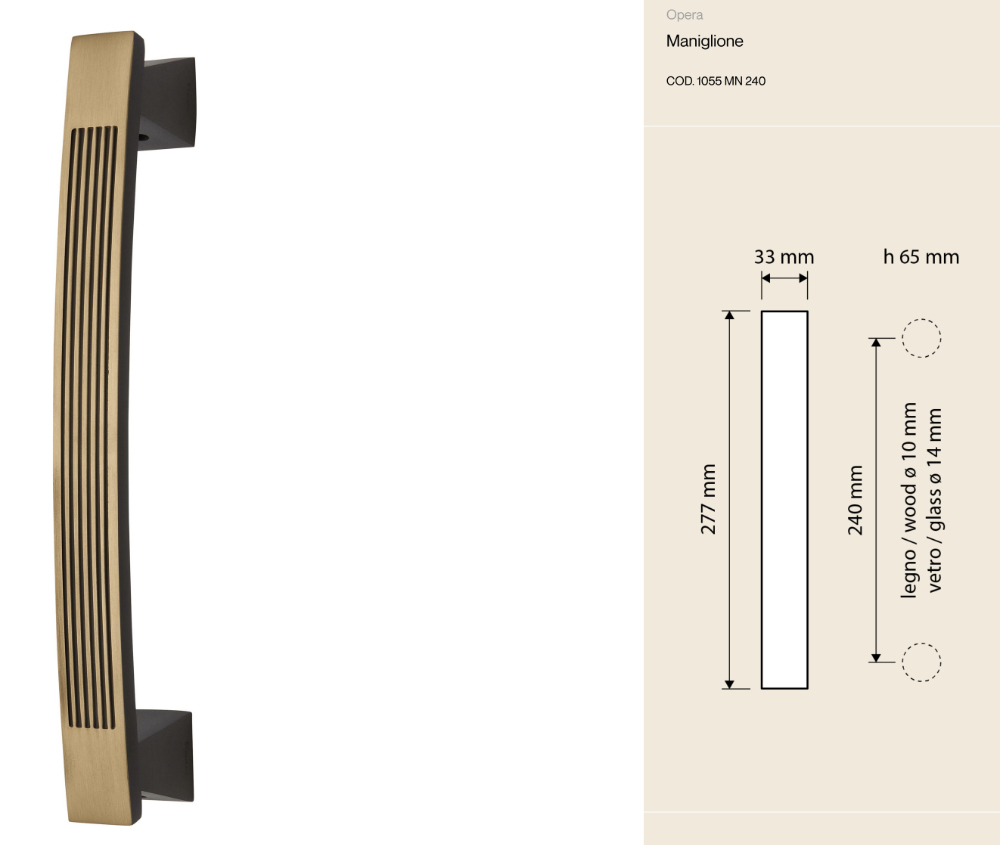 Entièrement réalisée en laiton dans la région artisanale de Brescia , la poignée Opera témoigne du souci du détail et de la qualité de fabrication qui caractérisent depuis toujours les produits authentiquement Made in Italy. Sa surface rainurée, précise et bien définie, souligne la solidité du métal et crée un jeu d'ombres et de lumières qui sublime sa profondeur et son élégance.