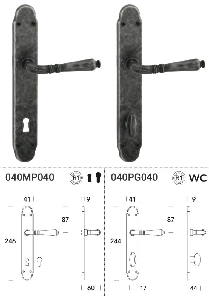 - Poignée sur plaque de dimensions 41x246 mm et 41x244 mm (version WC);