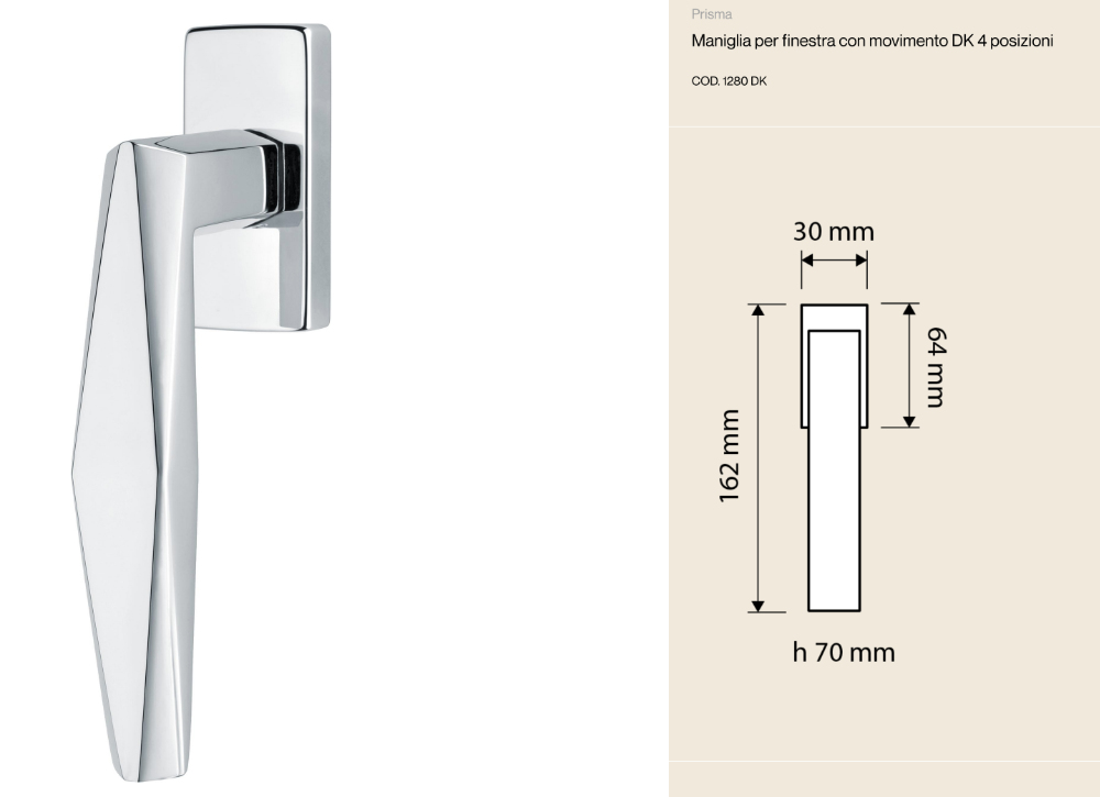 Poignée de fenêtre DK Prisma Linea Calì, au design moderne en forme de losange, en laiton et disponible à la commande en ligne dans de belles finitions Made in Italy.