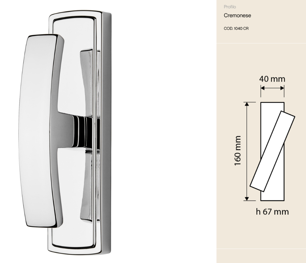 Depuis 1986, Linea Calì crée des poignées Crémone alliant design et fonctionnalité , transformant un simple geste en une expérience d'élégance au quotidien. Les poignées Crémone sont des poignées de fenêtre à levier vertical , permettant de verrouiller et de déverrouiller le vantail grâce à un système pratique et fiable.