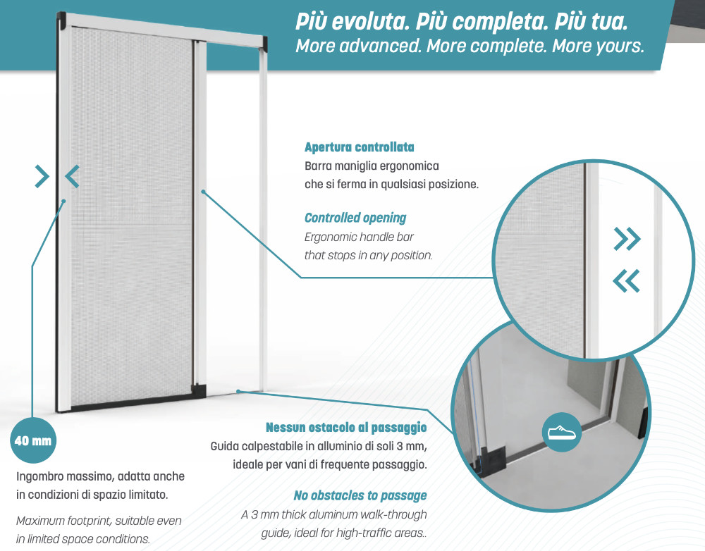 Le rail brossé assure une meilleure stabilité du filet même par temps venteux, tandis que le guide supérieur fermé offre une protection efficace contre l'entrée des insectes, même les plus petits et les plus gênants.