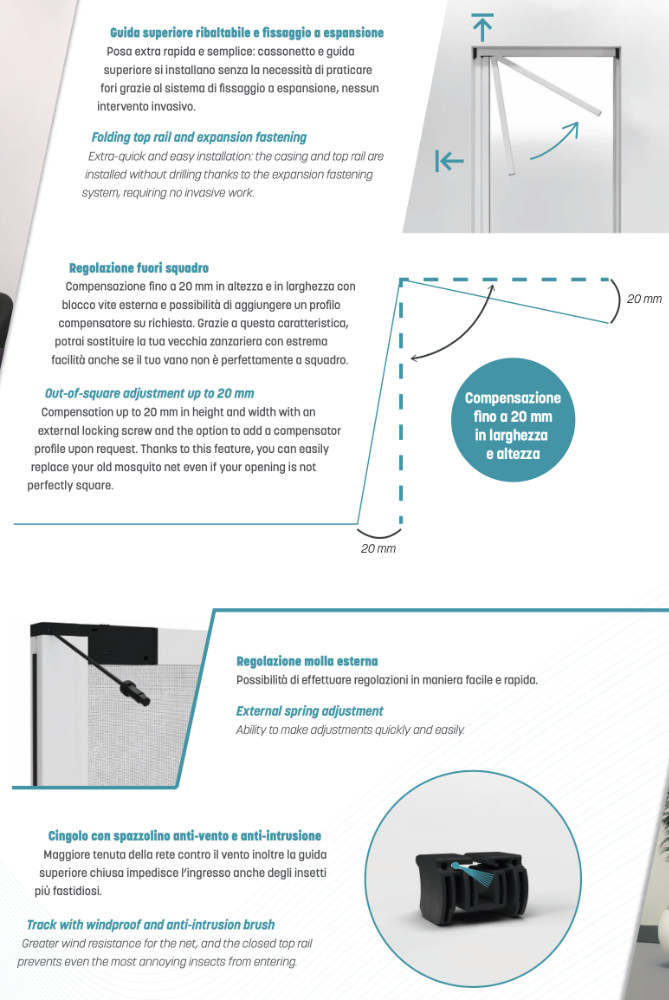 Réglage hors d'équerre Système de compensation jusqu'à 20 mm en hauteur et en largeur, avec verrouillage par vis externe et possibilité d'intégrer un profilé compensateur sur demande. Cette solution permet un remplacement rapide et facile des moustiquaires existantes, même dans les espaces non parfaitement carrés.