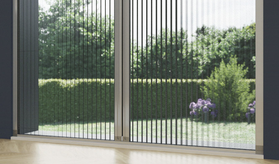 moustiquaire Smart Primed : un modèle plissé en aluminium conçu pour les fenêtres et les portes-fenêtres, avec un coulissement latéral fluide et un guide inférieur de seulement 15 mm qui garantit un passage sans obstacle.