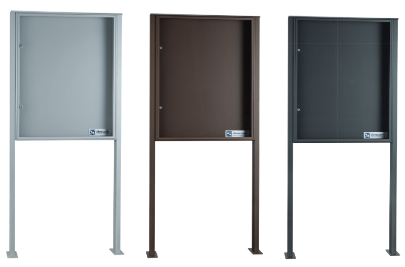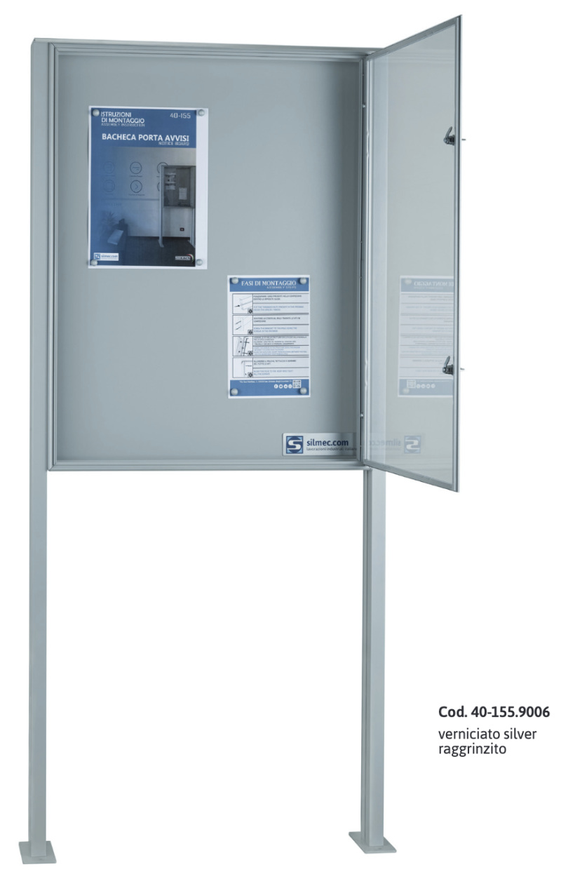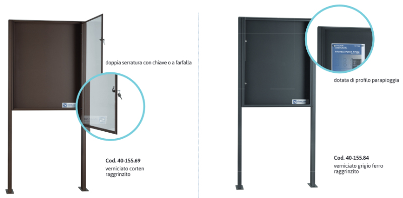 Le panneau d'affichage autoportant est disponible en trois versions différentes , pour une installation interne et externe, et est fourni avec quatre kits d'aimants en argent, pour un total de seize aimants. Ouverture avec double serrure à clé (pour empêcher l'ouverture sans la clé) ou avec double serrure papillon (peut être ouverte par n'importe qui).