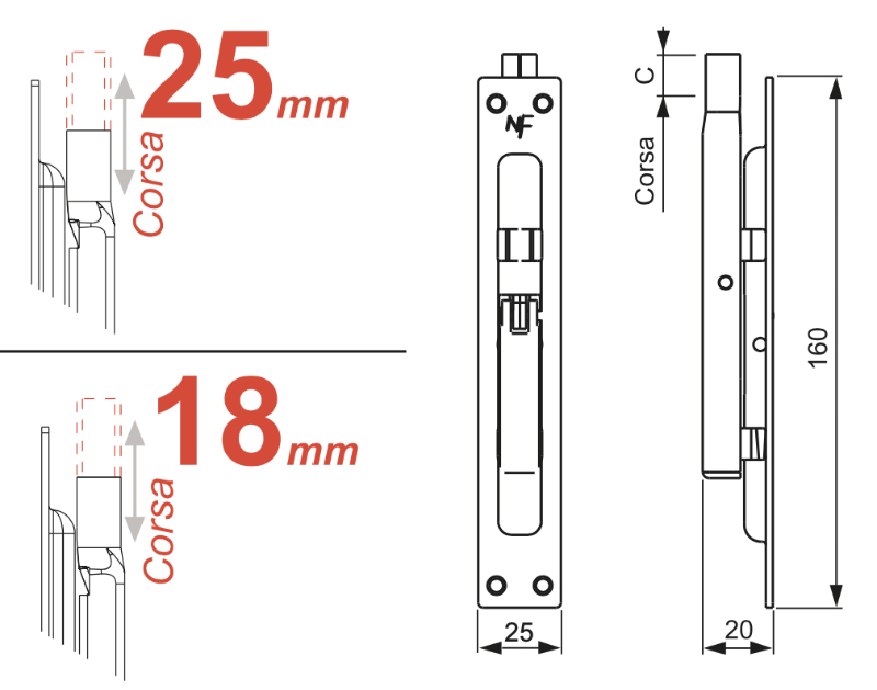 Sélectionnez la variante que vous souhaitez pour le pêne encastré Nova Ferr : levier, façade et course de votre choix.